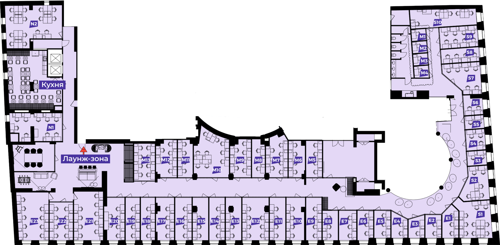 Тихие и комфортные пространства с эргономичной и умной мебелью и отличным видом. Каждый кабинет оборудован умными столами с розетками и usb-портами, тумбами на замках и удобными креслами.